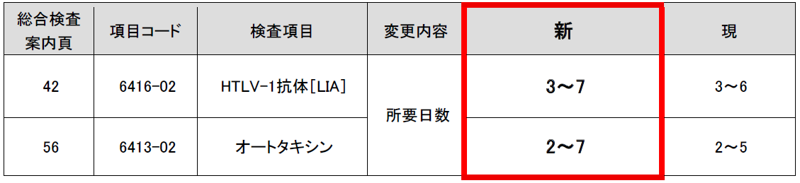 このたび、下記検査項目の所要日数を変更しますのでご案内いたします。