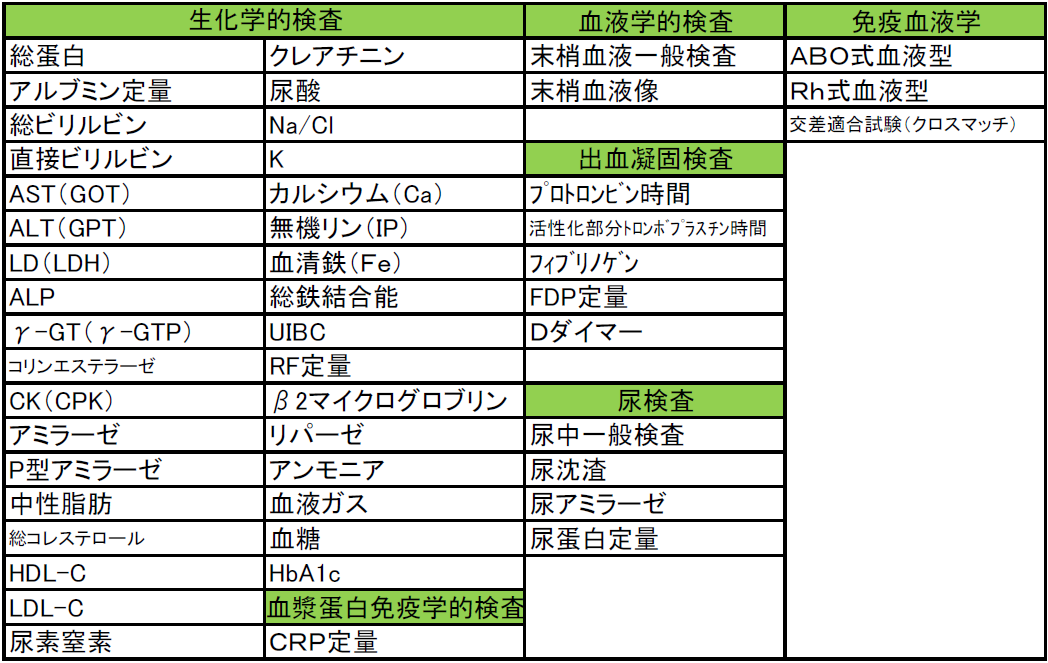 検査実施項目については、下記の表をご参照願います。