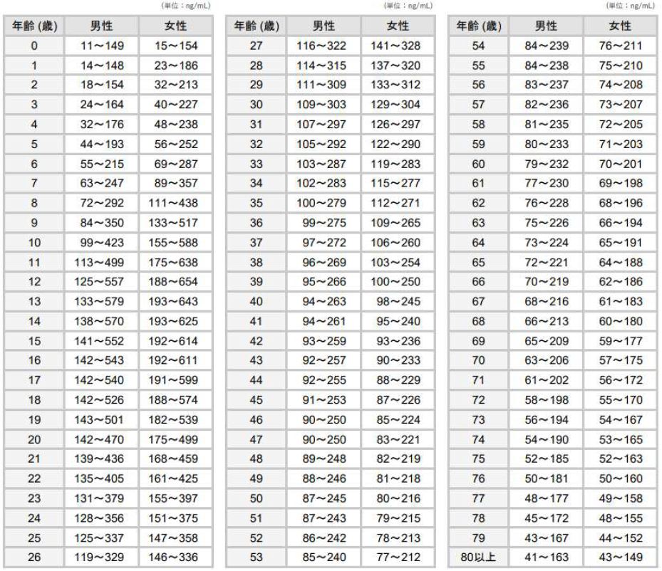 IGF-1 (ソマトメジンC) 年齢および性別基準範囲